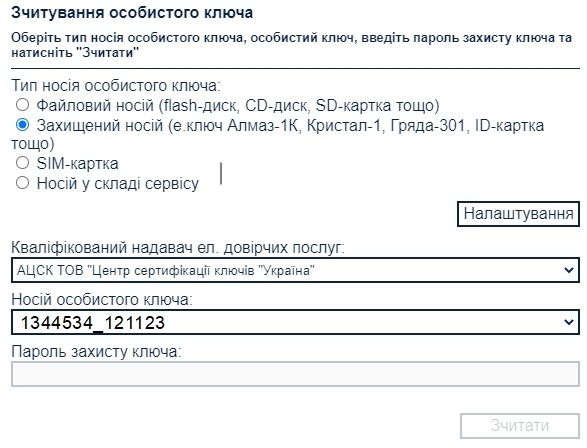 Після встановлення підключіть токен до комп’ютера. В полі “Тип носія особистого ключа” оберіть “Захищений носій”. Далі оберіть АЦСК та введіть пароль. Якщо токен розпізнається коректно, поле “Носій особистого ключа” має заповнитися автоматично. Натисніть кнопку “Зчитати”.