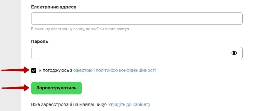 5 Ознайомтеся з офертою, політикою конфіденційності, поставте відмітку та натисніть “Зареєструватись”.