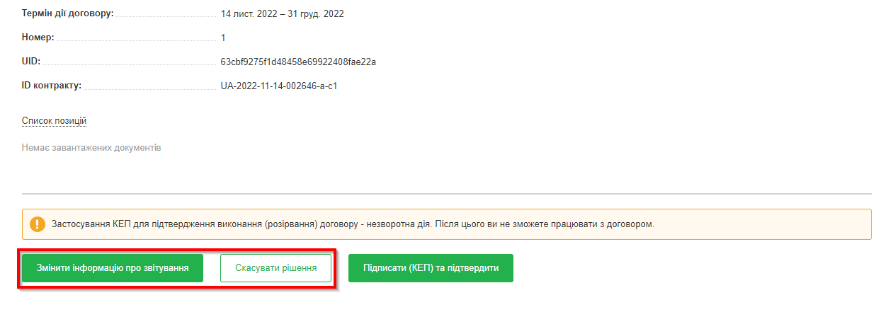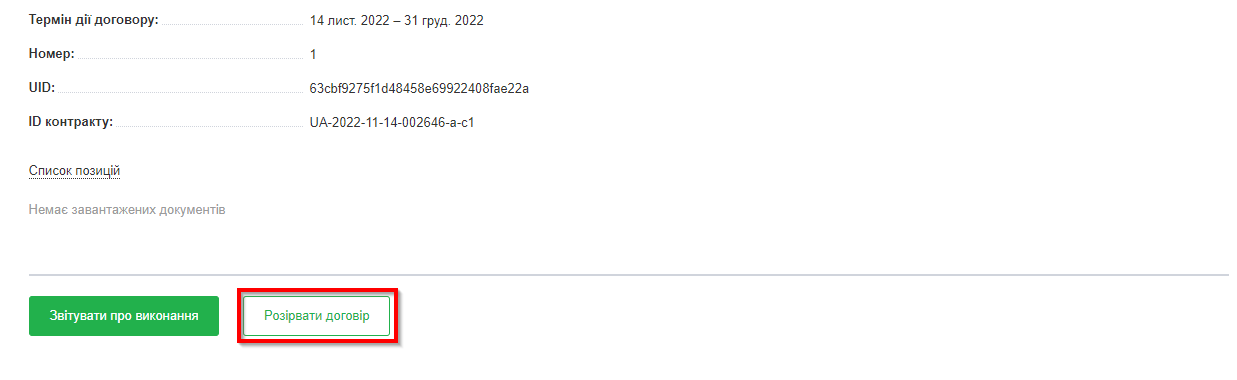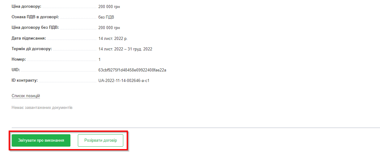 Для формування звіту про виконання у вас з’являться дві кнопки: “Звітувати про виконання” та “Розірвати договір”. Розглянемо кожну з них.