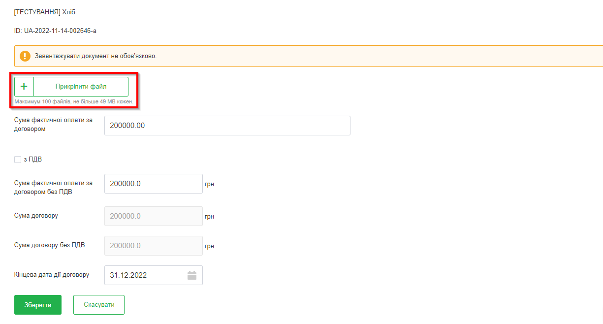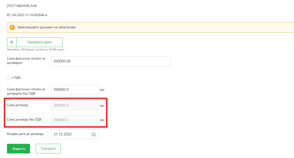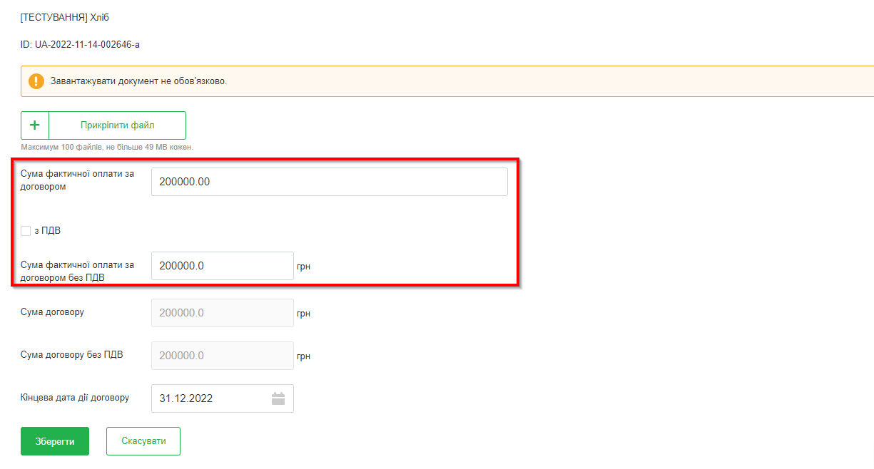 Відкриється сторінка, на якій ви побачите 4 рядки з сумами. Перші два – це сума фактичної оплати з/без ПДВ. Їх можна редагувати, якщо по факту ви оплатили дещо менше (мінімум можна поставити 1 копійку). Редагувати можна тільки в меншу сторону. Збільшити суму можна буде тільки під час публікації додаткових угод. Також на цій сторінці ви можете редагувати ознаку ПДВ (зняти або поставити галочку):
