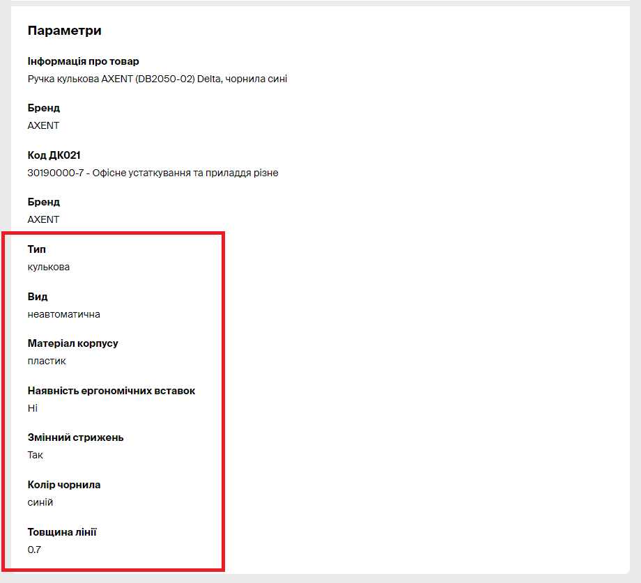 До прикладу: картка товару «Ручка кулькова AXENT»