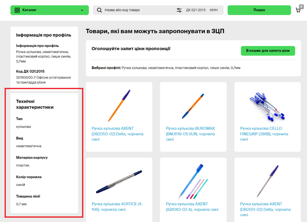При закупівлі товару в Prozorro Market, замовнику важливо пам’ятати, що в електронному каталозі він купує не конкретний товар, а певний набір характеристик (профіль) цього товару. Тобто, для того, щоб оголосити запит пропозицій, замовнику необхідно обрати профіль і додати його в кошик.