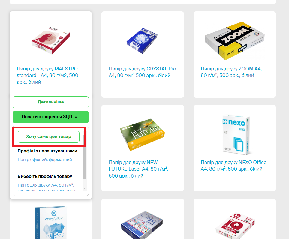 Ним можуть скористатись замовники, у яких річна потреба по коду ДК не перевищує 500 тис.грн. Кнопка «Хочу саме цей товар» – це той самий профіль з налаштуваннями, але система самостійно за замовника визначила ті характеристики, які є в картці товару.