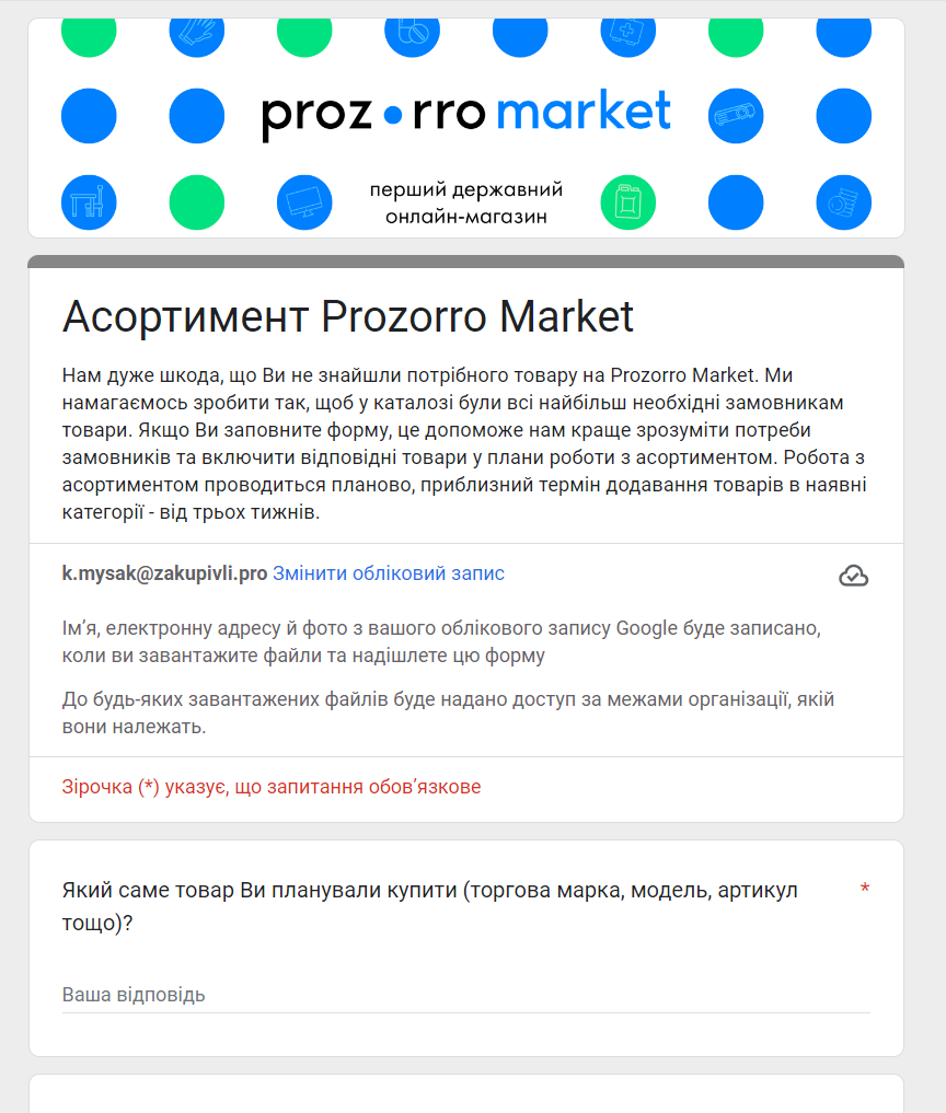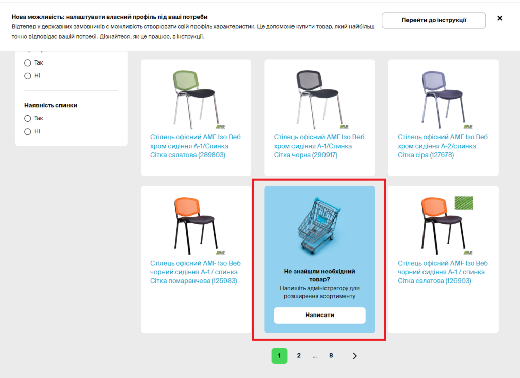 Якщо замовник не знайшов необхідний товар, необхідно письмово звернутись на електронну адресу до адміністратора каталогу, щодо можливості додавання товару в Prozorro Market, або надіслати таке звернення через електронний майданчик, через кнопку «Написати»