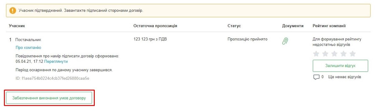 Коли закупівля перейде у статус “Пропозиції розглянуті”, переможець має надати забезпечення виконання договору у вигляді документу. В залежності від вимог до цього забезпечення це може бути файл з гарантією, платіжне доручення, якщо забезпечення вимагалось у вигляді депозиту тощо.