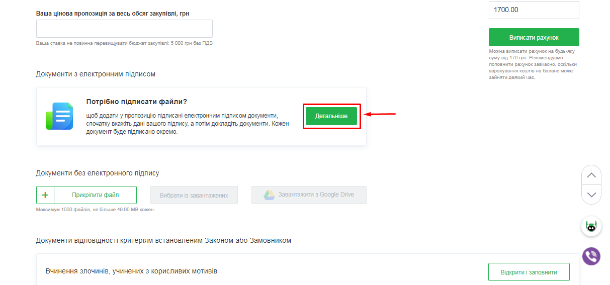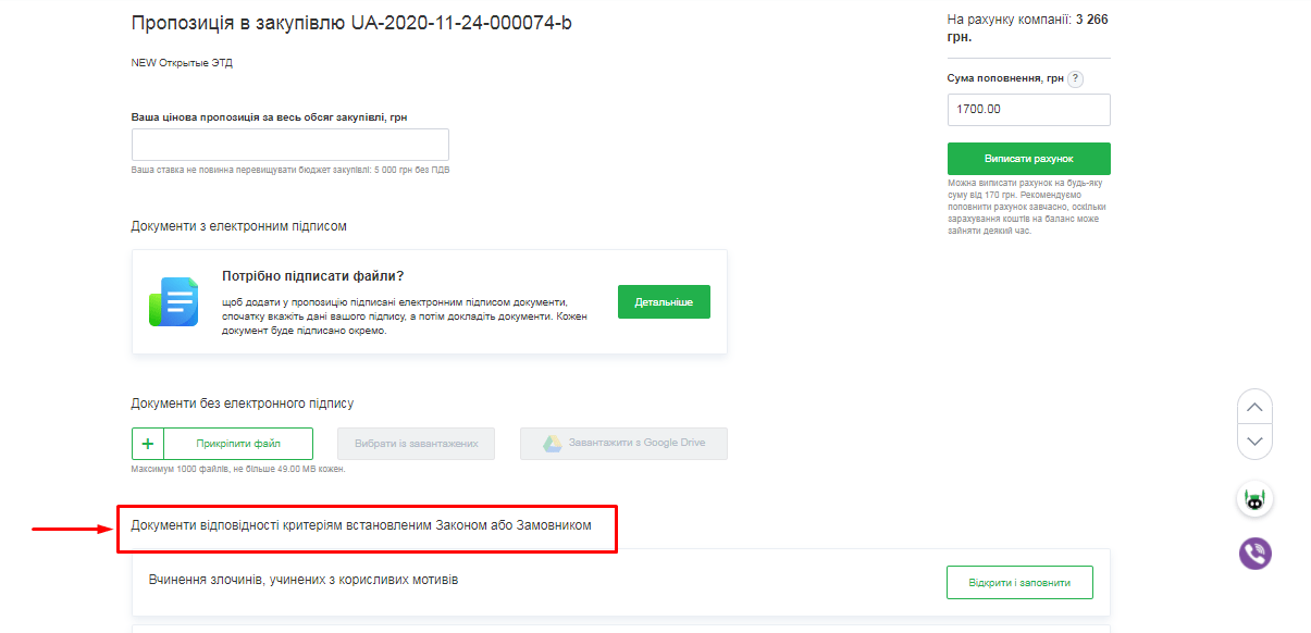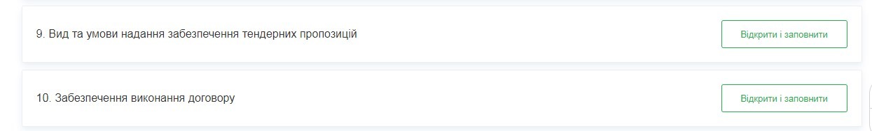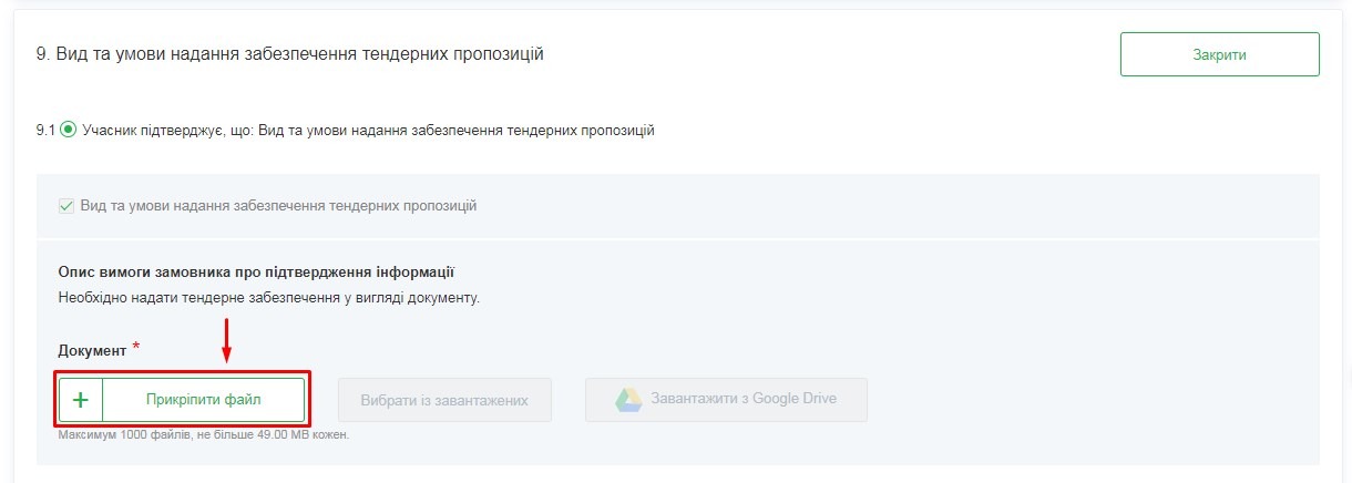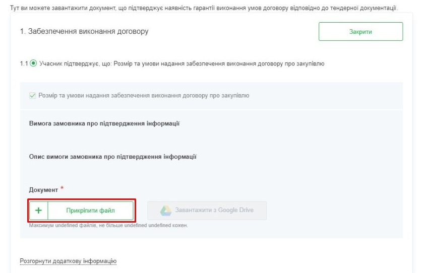 Вид та умови надання забезпечення тендерних пропозиції. Щоб заповнити цей критерій, натисніть “Відкрити та розгорнути”, а потім прикріпіть необхідний документ. Ви також можете вибрати його із завантажених файлів або завантажити з Google Drive.