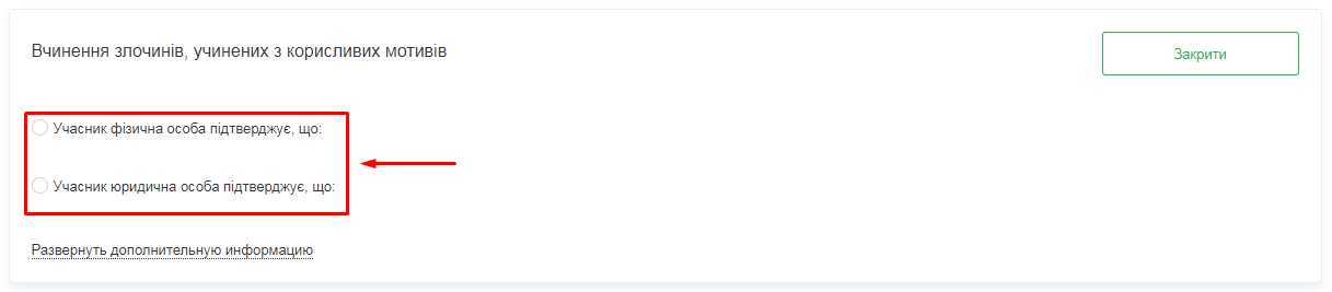 Виберіть один із варіантів, який відповідає вашій ситуації та підтвердіть інформацію, якщо державний замовник додав спосіб підтвердження.