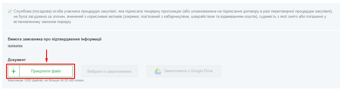 Як ви бачите на вищезазначеному скріншоті, у даному полі постачальнику не потрібно для підтвердження інформації ані прикріпляти файл, ані заповнювати текстове поле.