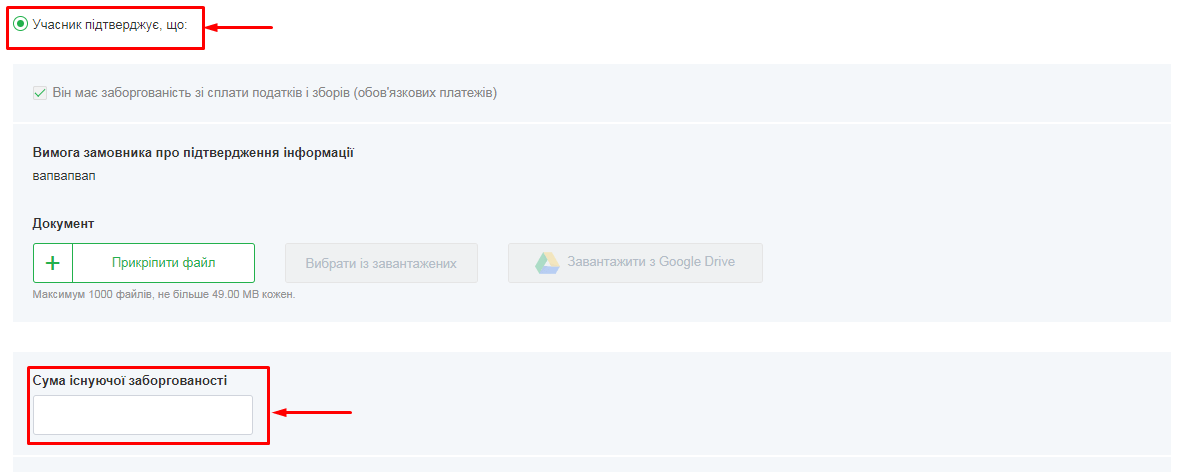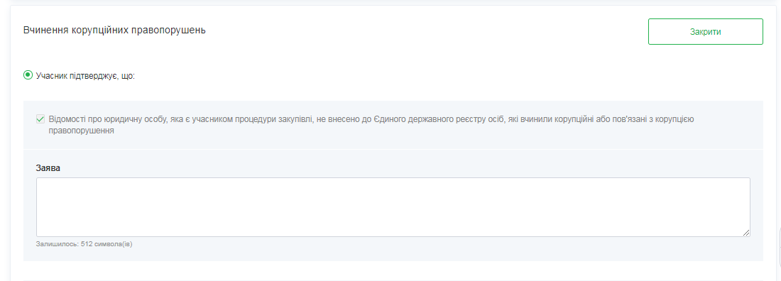У полі заява потрібно простим текстом вписати, що учасник відповідає даному критерію по статті 17. Вище над полем “заява” вказано до якого саме критерія вона відноситься. Наприклад: “ТОВ “Учасник” підтверджує, що не має заборгованості зі сплати податків і зборів (обов’язкових платежів)”.