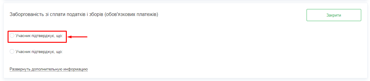 Якщо у вас не має податкової заборгованості, поставте відмітку у першому рядку та підтвердіть вказану інформацію.