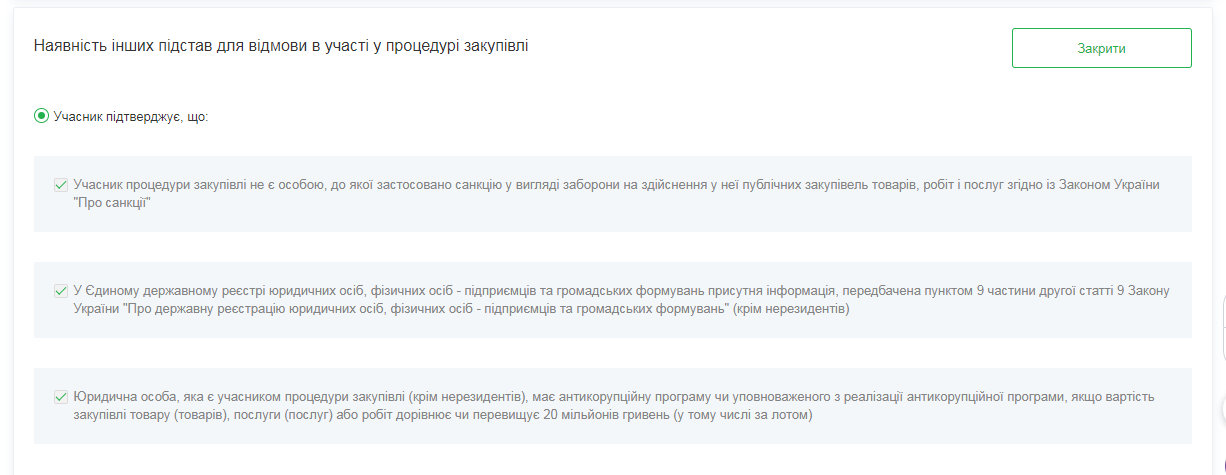 Починаючи з 4 грудня 2020 року для підтвердження відсутності підстав для відмови в участі у закупівлі постачальнику необхідно заповнити відповідні критерії.