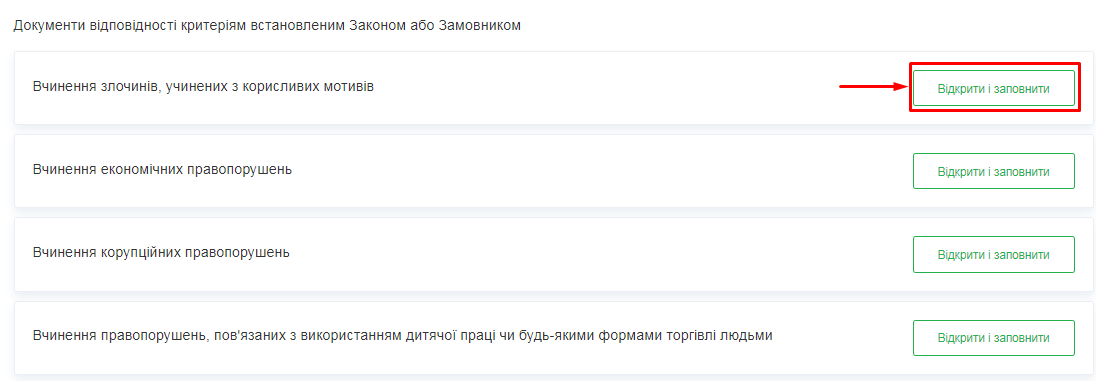 Таким чином, щоб заповнити блок “Документи відповідності критеріям встановленим Законом або Замовником”, необхідно по кожному із критеріїв зробити наступне.