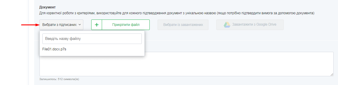 Якщо ви бажаєте додати файл, підписаний електронним підписом, спочатку докладіть його. Більше детально про те, як це зробити, читайте у цій інструкції.