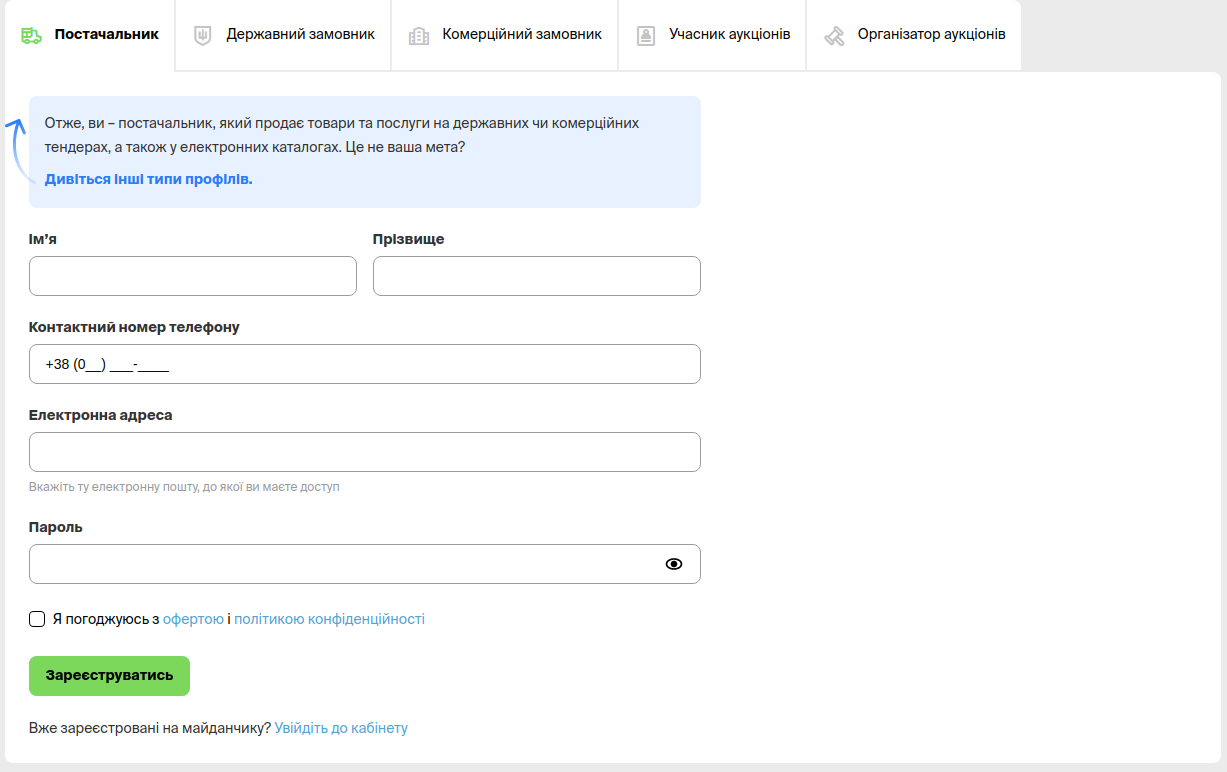 • Електронну адресу. Для того, щоб отримувати повідомлення, які стосуються всіх етапів закупівлі. Також електронна адреса буде використовуватися, як логін для входу в особистий кабінет постачальника