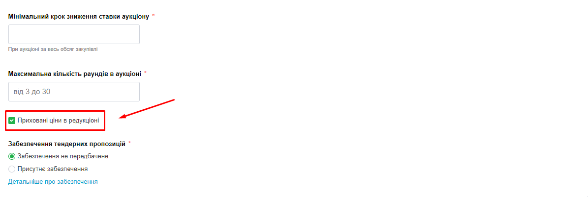 За потреби ви можете зробити так, щоб на етапі редукціону учасники не бачили ставки один одного. Для цього поставте відмітку навпроти Приховані ціни в редукціоні.