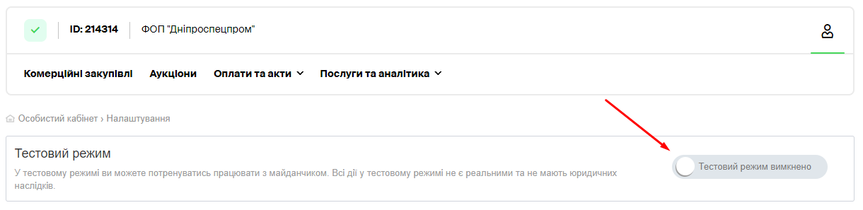 Перед тим, як розпочати роботу із закупівлями, про всяк випадок переконайтеся, що тестовий режим вимкнено. Адже всі дії у тестовому режимі не є реальними та не мають юридичних наслідків.