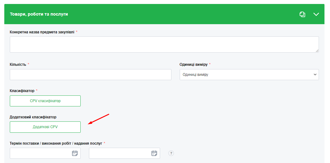 Зверніть увагу, що за потреби ви можете вказати декілька CPV, щоб допомогти постачальникам знаходити ваші закупівлі. Для цього натисніть Додаткові CPV та виберіть необхідні коди.