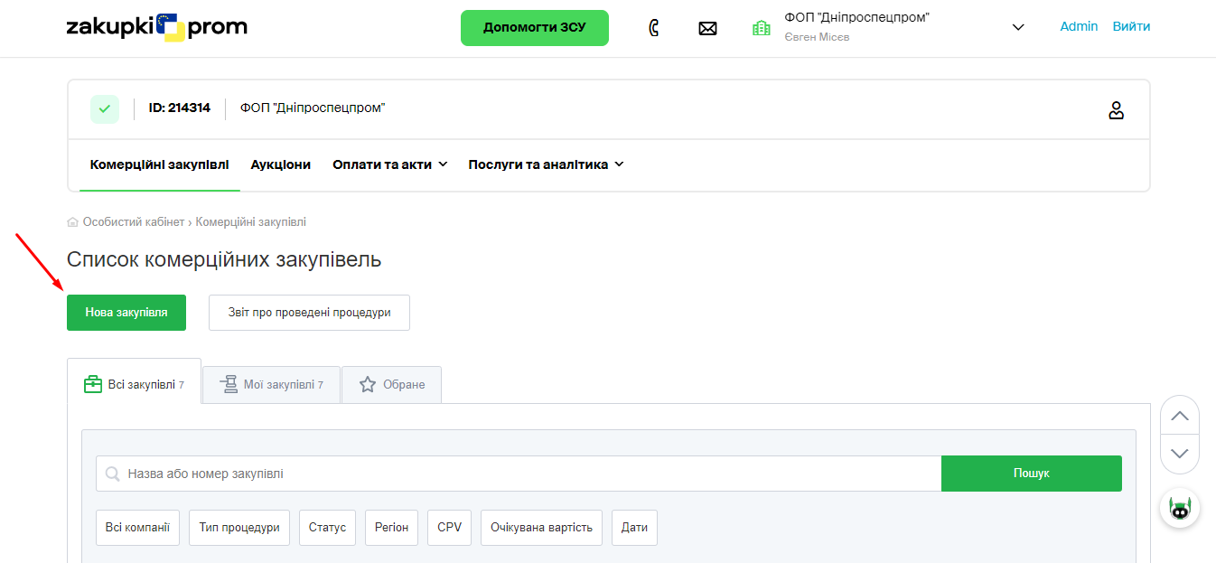 1. Щоб створити нову закупівлю, перейдіть у розділ “Комерційні закупівлі” та натисніть “Нова закупівля”.