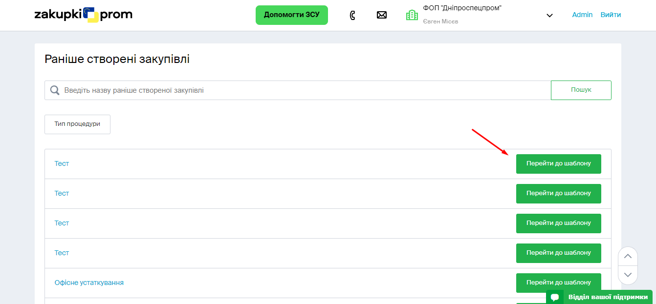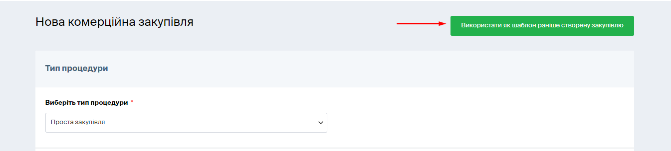 Якщо раніше ви вже оголошували аналогічну закупівлю, то для економії часу ви можете використати її як шаблон. Для цього натисніть на відповідну кнопку та зі списку виберіть раніше створену закупівлю.
