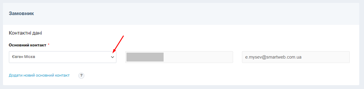 3. У розділі “Замовник” буде відображатися основний контакт. За бажанням, ви можете його замінити на іншого співробітника в структурі вашої компанії в кабінеті або додати новий контакт.