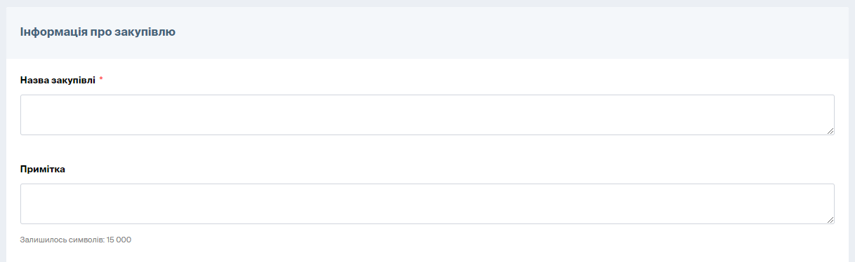 4. Вкажіть конкретну назву закупівлі. У примітках дайте розгорнутий опис закупівлі, вкажіть необхідні та значущі параметри, пропишіть ще раз очікувану вартість закупівлі з ПДВ чи без ПДВ.