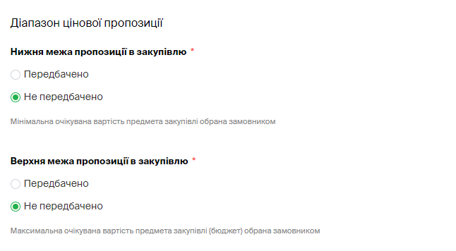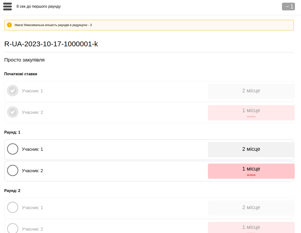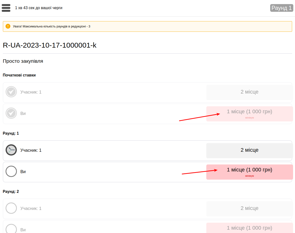 У разі, якщо ціни будуть приховані, учасники замість цін будуть бачити свою ставку, а також Місце 1, Місце 2 і т.д. (Місце 1 означає найменшу ставку).