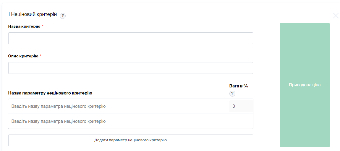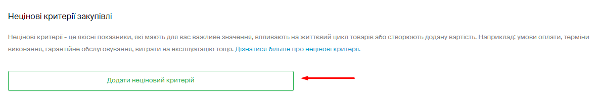 Неціновими критеріями можуть бути швидкість доставки, гарантійний період, сервісне обслуговування, установка, консультації з використання чи інші. Зверніть увагу, загальна вага всіх нецінових критеріїв однієї пропозиції не може перевищувати 50%. Інакше, система не пропустить закупівлю і вона не буде створена.