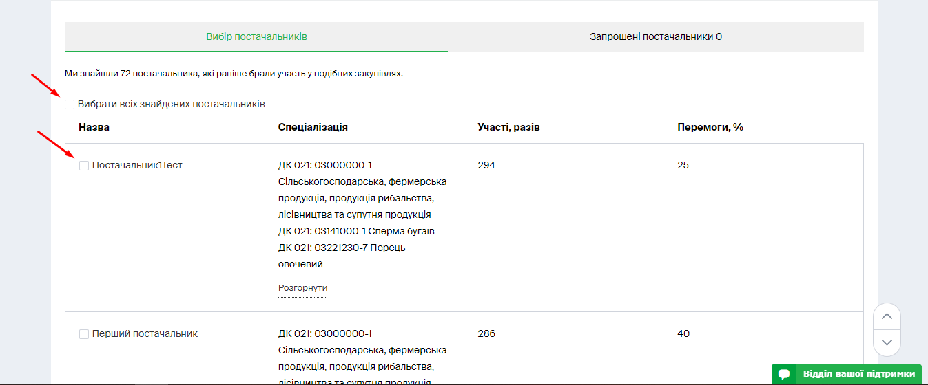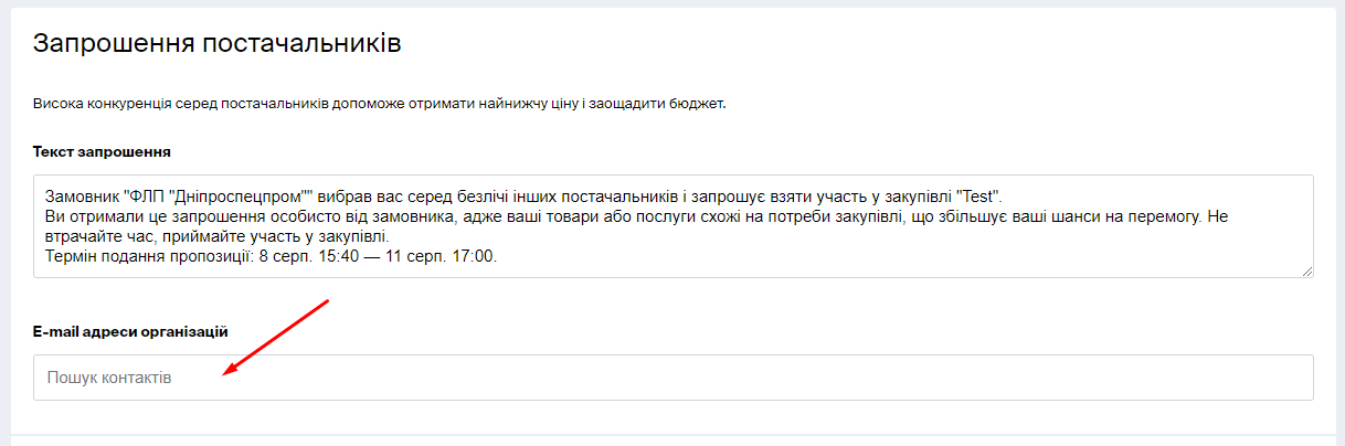 15. Після цього у вас відкриється сторінка “Запрошення постачальників”. Ви можете додати email постачальників, яких ви знаєте. Ми автоматично відправимо їм листа із запрошенням взяти участь у вашій закупівлі.