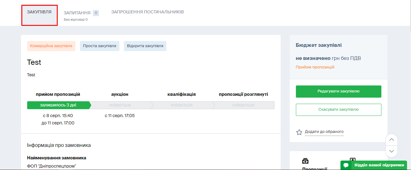 У вкладці “Закупівля” ви можете слідкувати за перебігом закупівлі, а також: