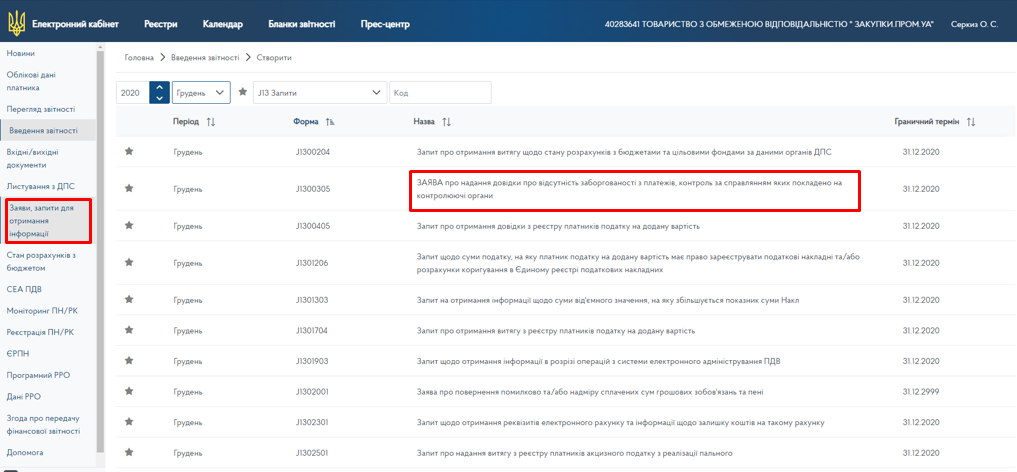 У лівому меню знайдіть розділ “Заяви, запити для отримання інформації”, увійдіть до нього та знайдіть форму “ЗАЯВА про надання довiдки про вiдсутнiсть заборгованостi з платежiв, контроль за справлянням яких покладено на контролюючi органи”.