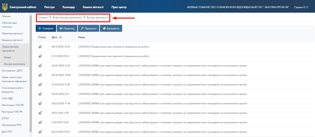 Після підписання заяви натисніть кнопку “Відправити”. Відправлена заява буде зберігатись у розділі “Вхідні/вихідні документи”.