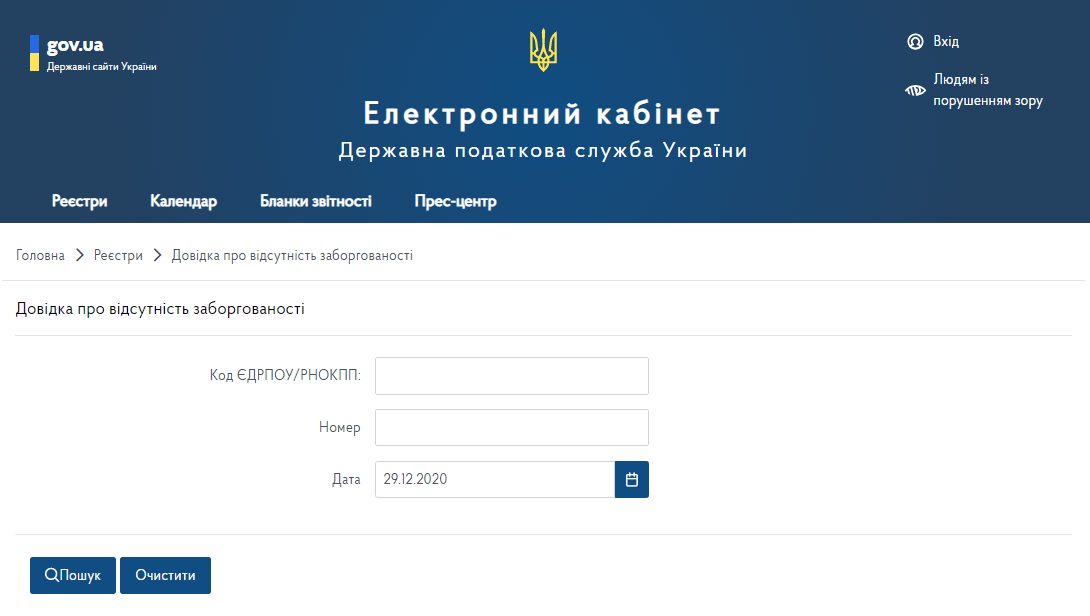 Видану довідку замовник або зацікавлені органи зможуть переглянути у відкритій частині Електронного кабінету платника, вхід до якої здійснюється без ідентифікації користувача – за посиланням.