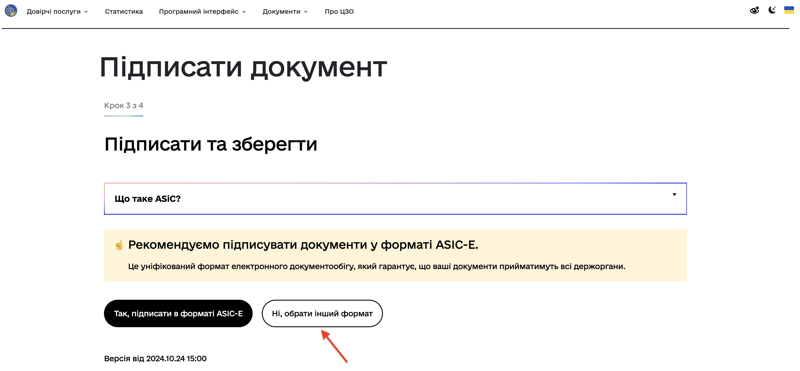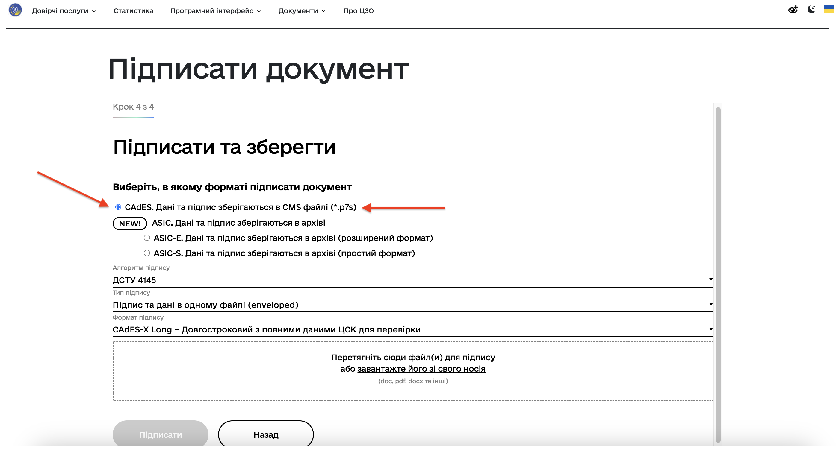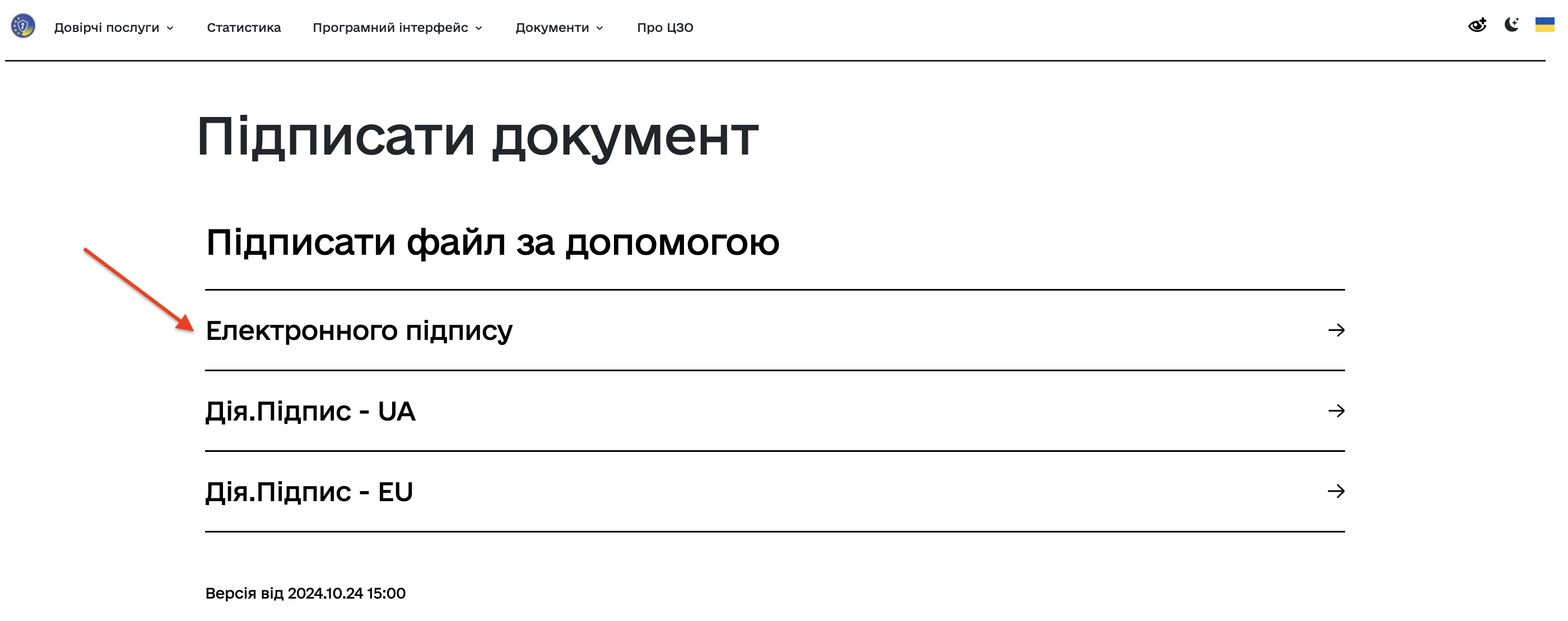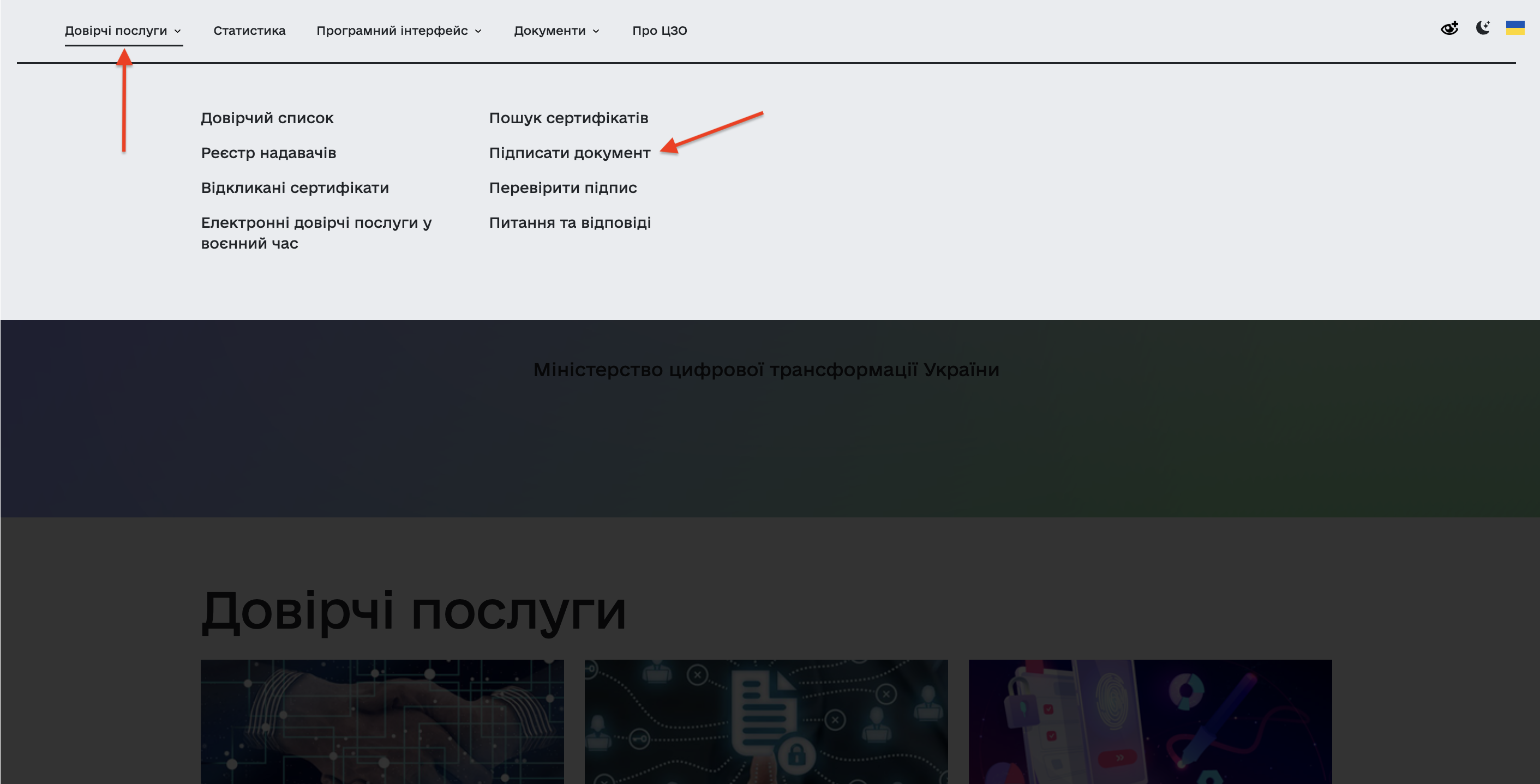 1. Перейдіть на сайт Центрального засвідчувального органу (ЦЗО) у розділ Довірчі послуги – Підписати документ.