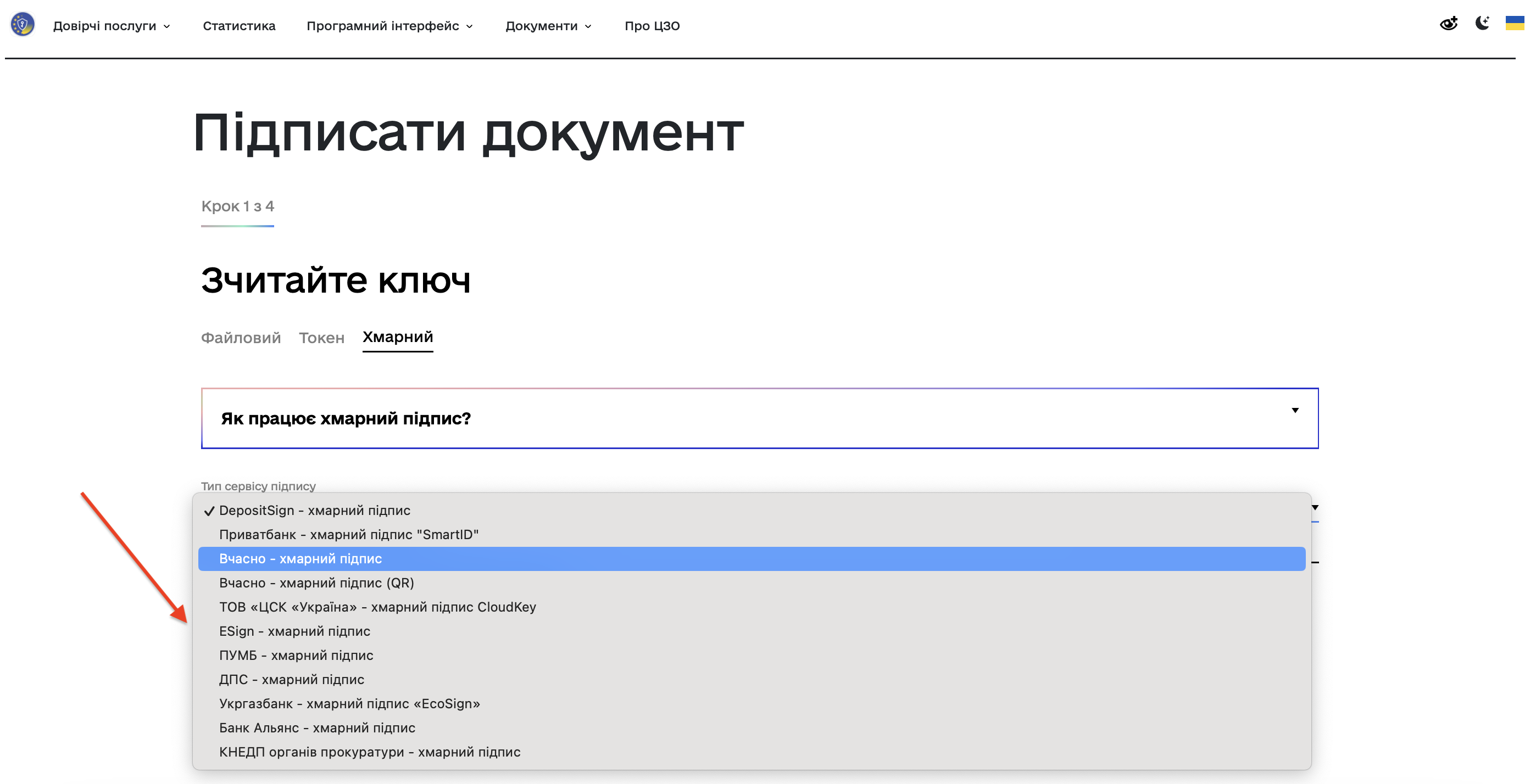 3.1 Виберіть тип сервісу підпису зі списку. Це організація, яка видала вам ключ.