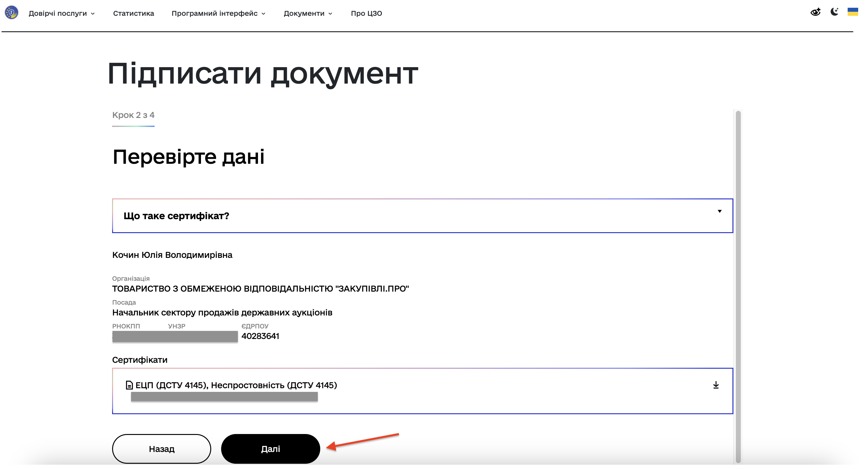 Важливо: підписаний файл у форматі p7s необхідно надіслати менеджеру майданчика ЗАКУПІВЛІ.ПРО, з яким ви на зв’язку. Майданчик підписує цей файл зі свого боку та надсилає організатору, який також накладає КЕП на файл та публікує його на сторінці аукціону.