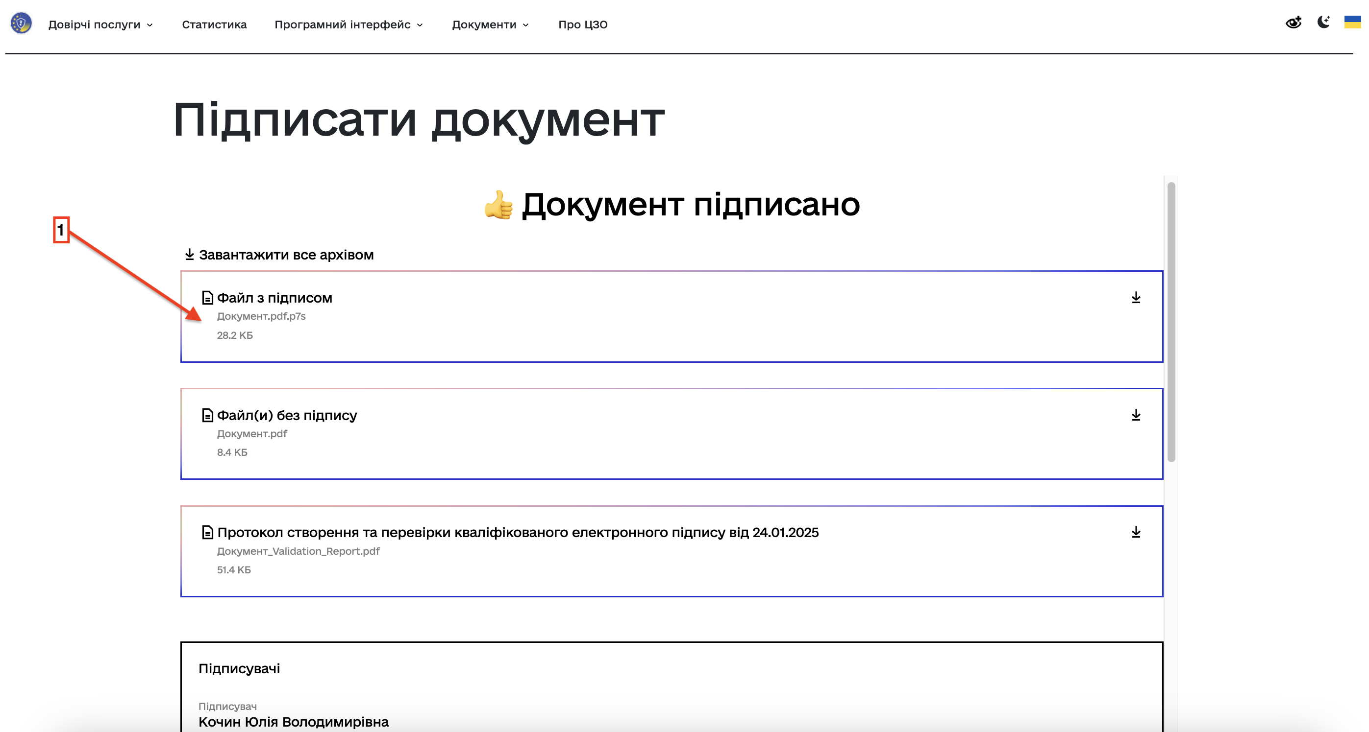 7. Чудово: файл підписаний. Далі завантажте файл з підписом (1).