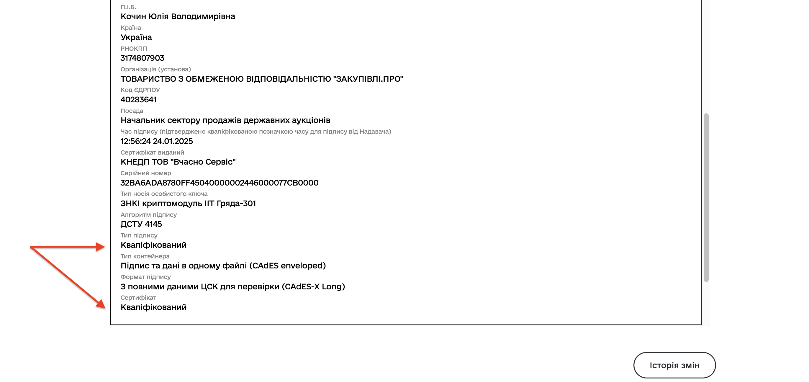 Зверніть увагу! Тип підпису та сертифікат мають бути Кваліфікованими. Якщо у вас тип підпису “Удосконалений” радимо звернутись в ваш центр сертифікації ключів, для отримання саме Кваліфікованого підпису. Так як удосконалений підпис не підходить для підписання документів для участі в аукціоні.