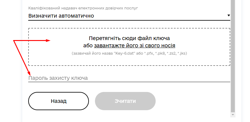 8. Якщо ви вирішили підписати за допомогою файлового ключа, завантажте його у відповідному полі, введіть пароль та натисніть “Зчитати”.