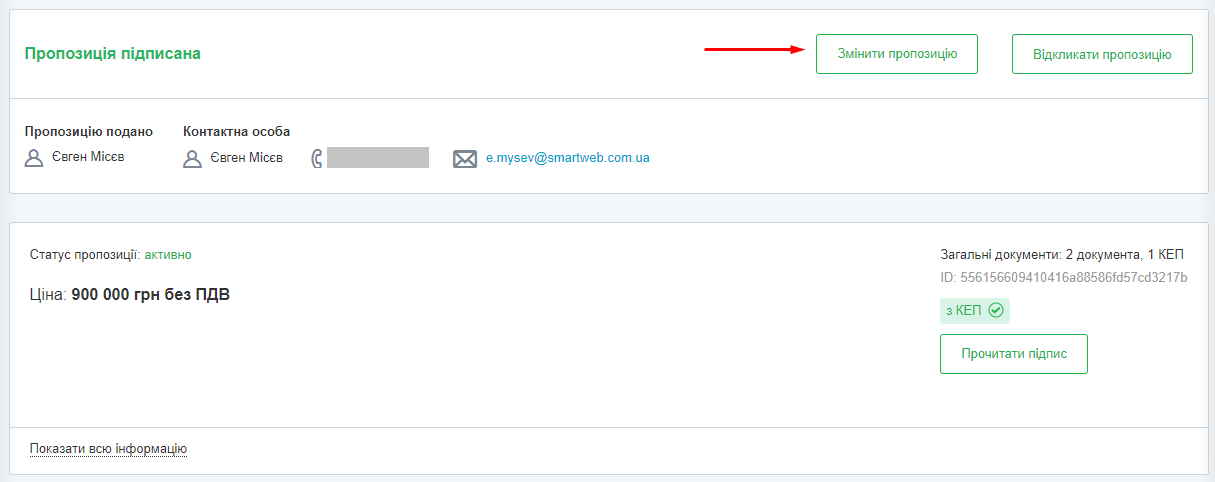 Зайдіть на сторінку закупівлі та у блоці “Пропозиція підписана” натисніть “Змінити пропозицію”.