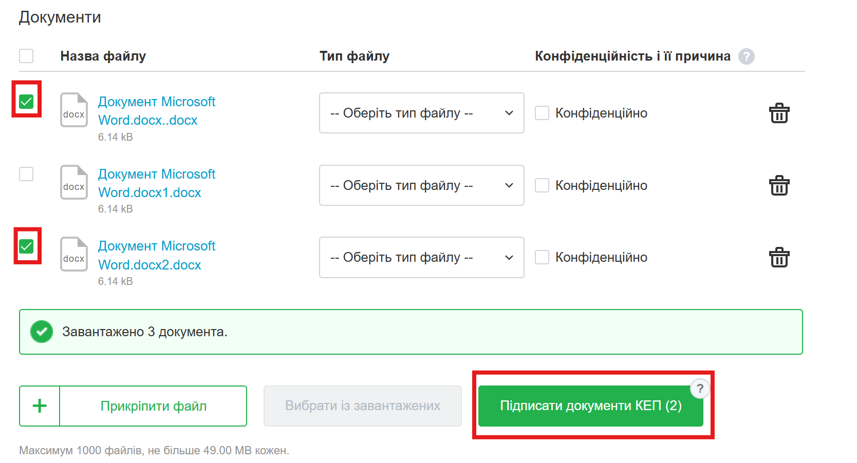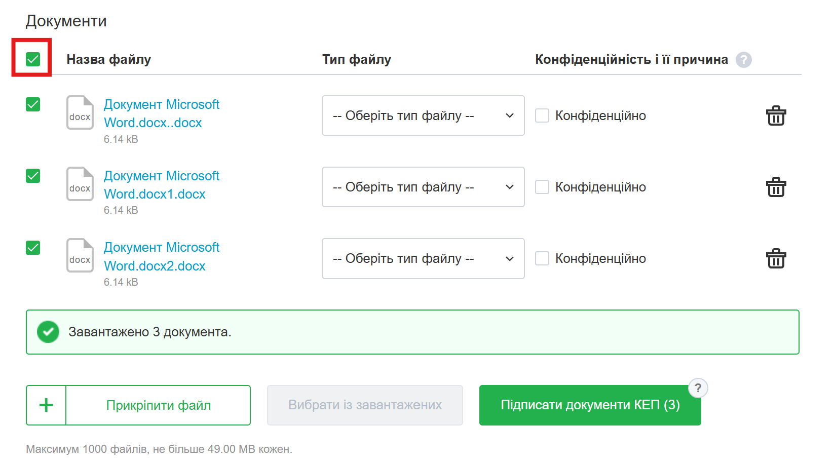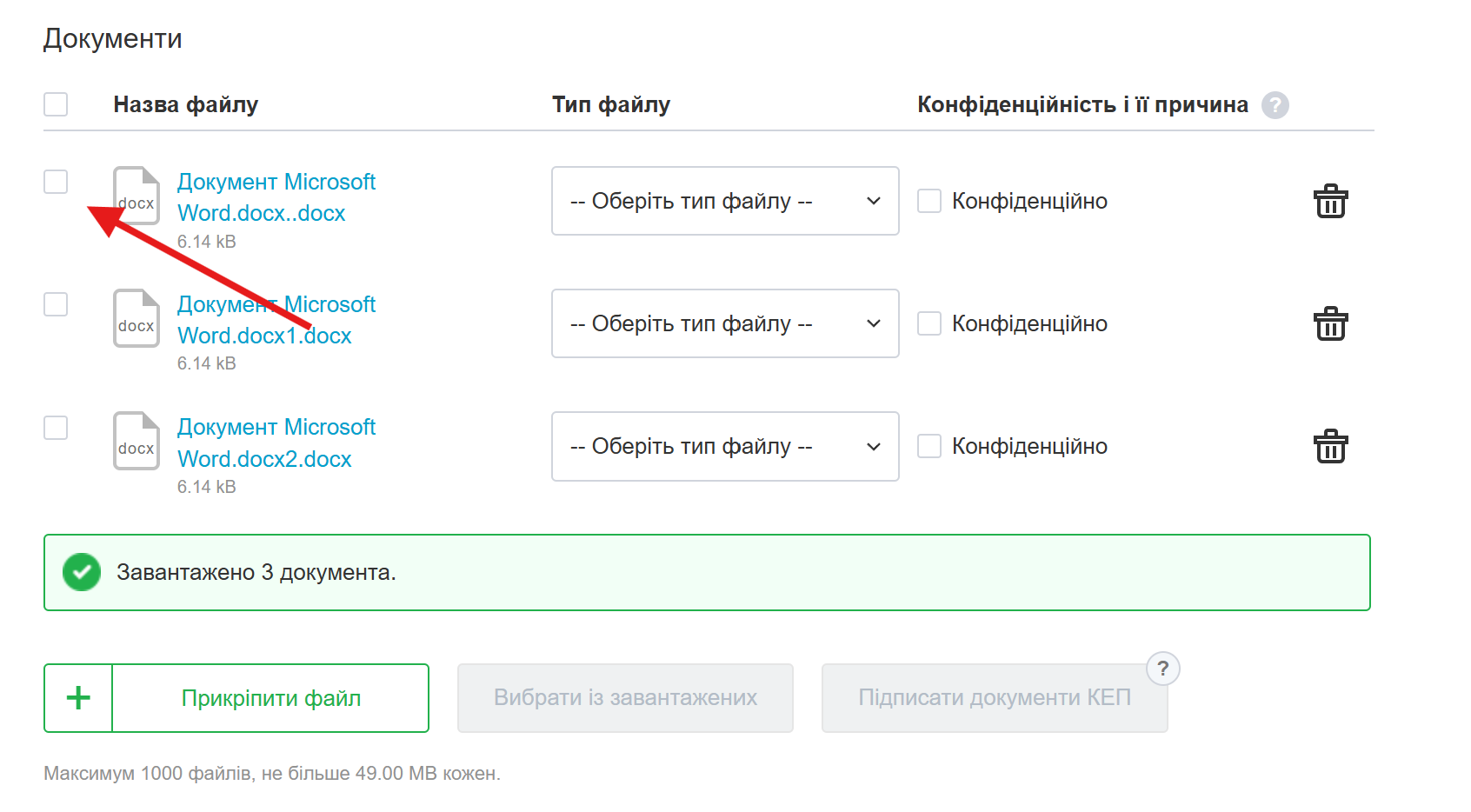 3. Ліворуч від кожного завантаженого документа з’явиться поле для позначки. Виберіть ті документи, які потрібно підписати.