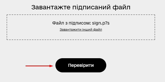 4. Натисніть “Перевірити“. Готово! Щоб перевірити підпис прогорніть сторінку трохи нижче, та ви побачите усю інформацію про підписувача та підпис.
