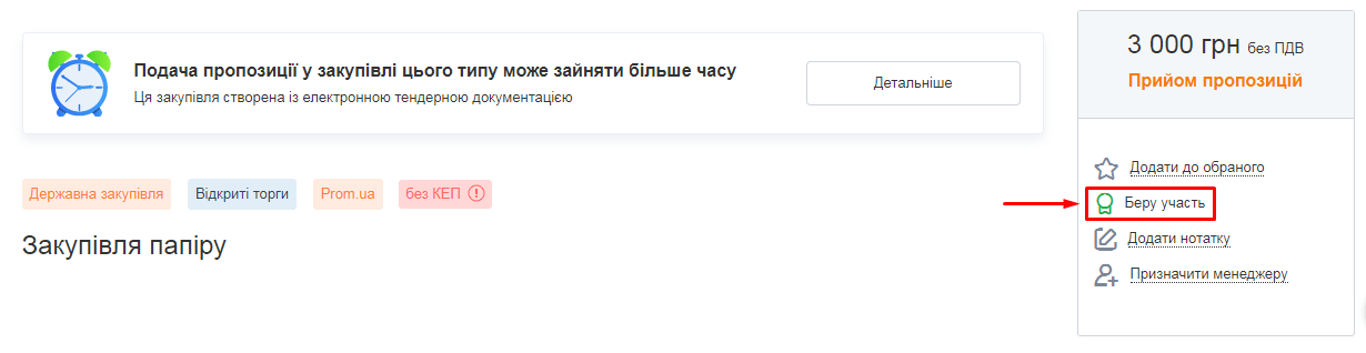 4. На сторінці закупівлі у блоці під сумою предмета закупівлі з’являється позначка “Беру участь”.