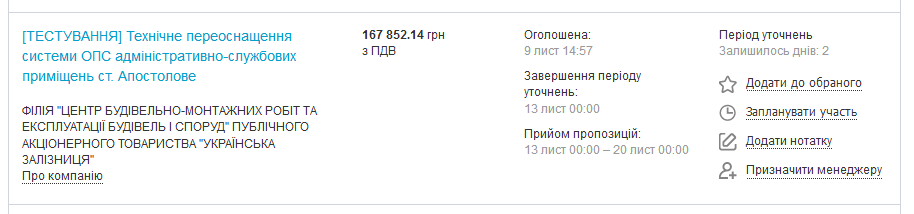 Менеджер, якому призначено закупівлю, отримає про це повідомлення. Він, а також усі співробітники компанії, що працюють у кабінеті постачальника, у списку закупівель будуть бачити, що цю закупівлю закріплено за ним.