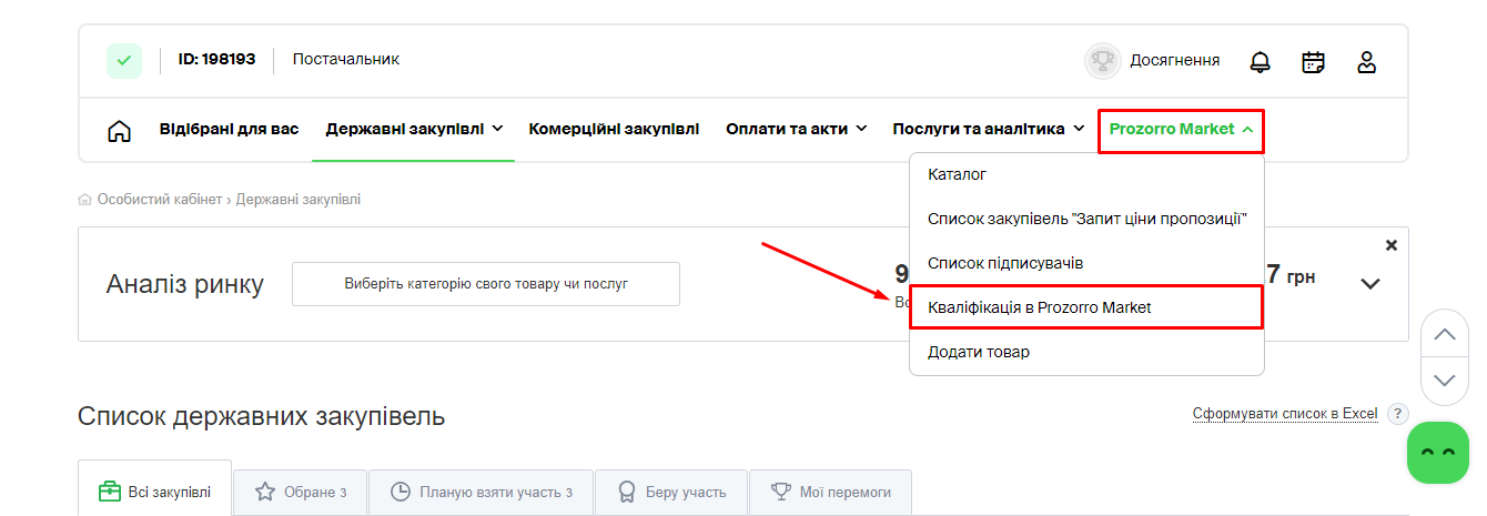 Крок 1 – Перейдіть в особистому кабінеті постачальника в розділ “Prozorro Market” – “Кваліфікація в Prozorro Market”.