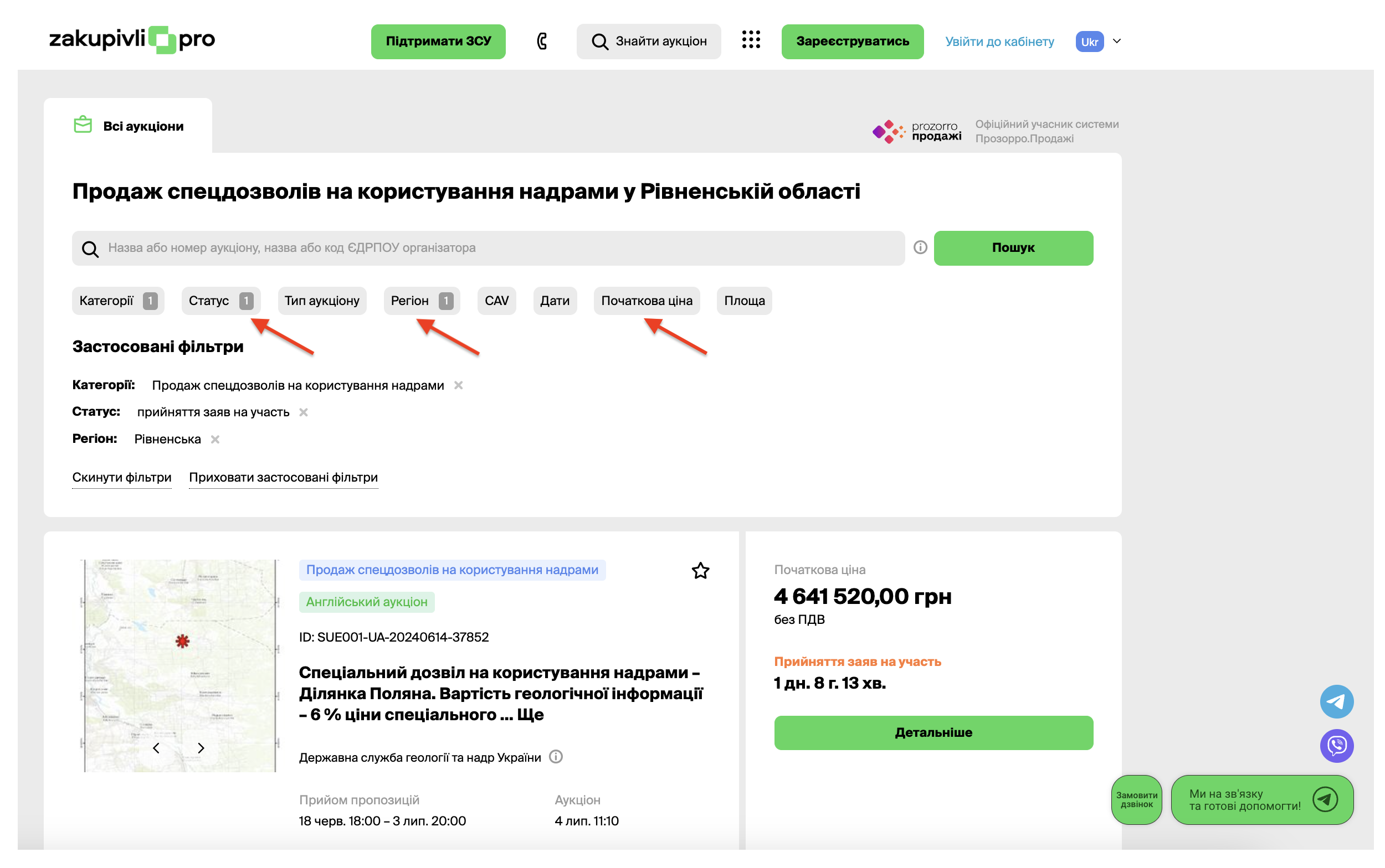 Після натискання кнопки “Пошук” автоматично відфільтруються аукціони відповідно вашого запиту.