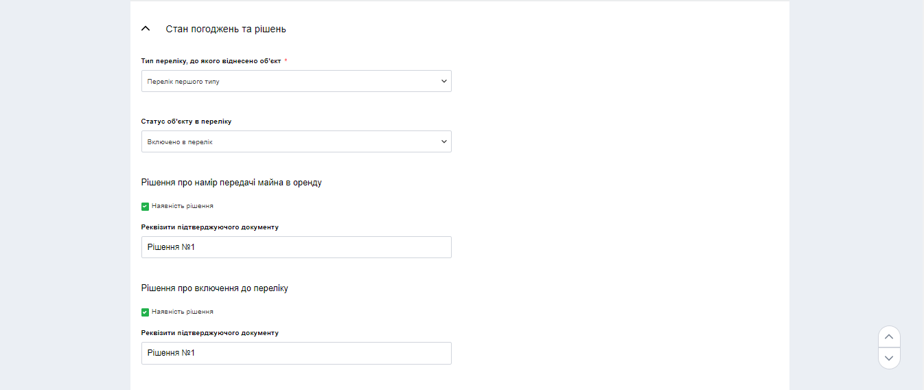 У цьому розділі ви можете завантажити Рішення про затвердження переліку об’єктів, або про включення нового об’єкта до переліку.
