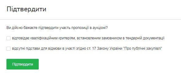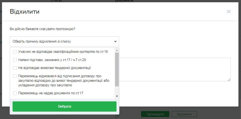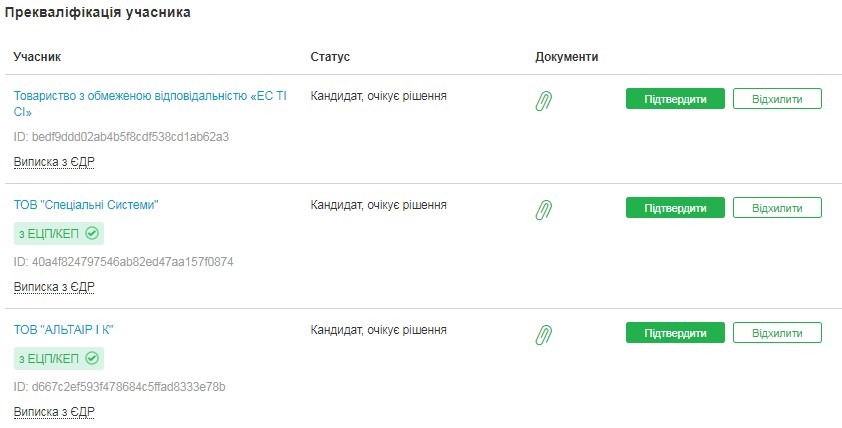 Щоб оголосити свої рішення щодо допуску до аукціону на пониження, оцініть пропозиції кожного учасника та натисніть кнопку “Підтвердити” або “Відхилити”.