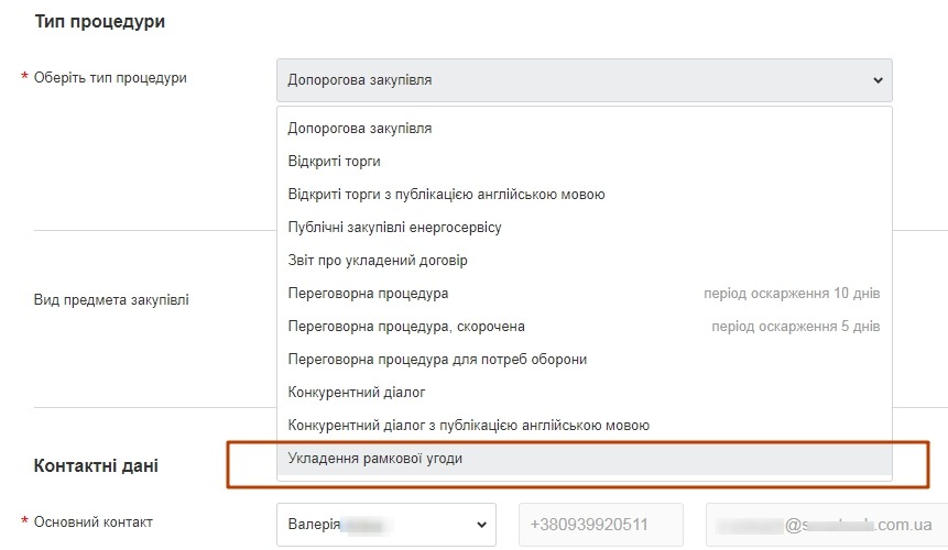 Натисніть на кнопку “Нова закупівля” та у новій сторінці у полі “Тип процедури” виберіть зі списку “Укладення рамкової угоди”.