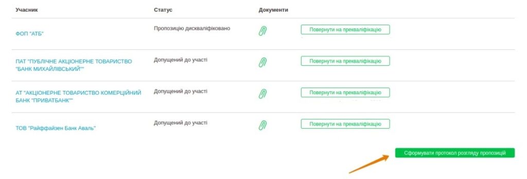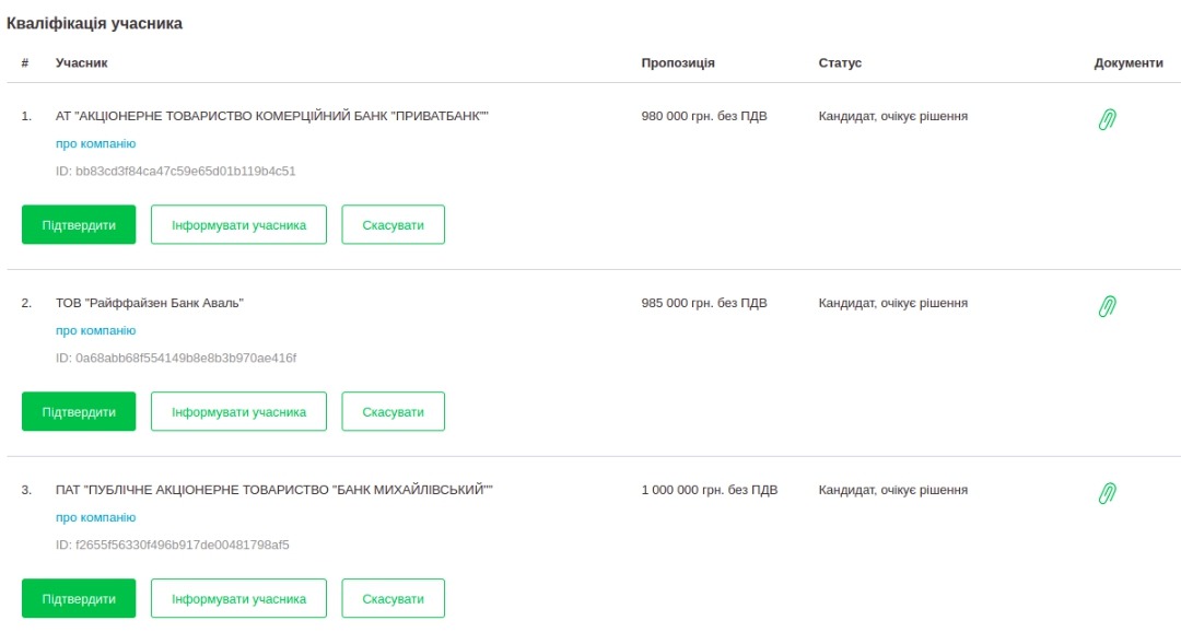 Під час етапу кваліфікації вам необхідно розглянути пропозиції учасників, що стали переможцями етапу аукціону, схвалити чи відхилити їх. Розглядати пропозиції ви можете у будь-якій послідовності.