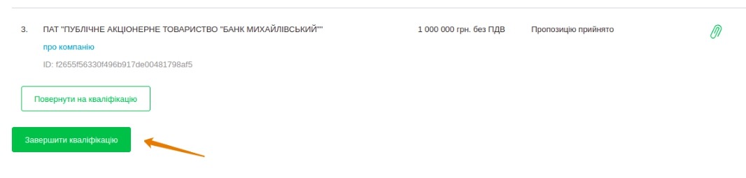 Після того, як ви приймете рішення щодо усіх постачальників, що перебувають на розгляді, необхідно натиснути кнопку “Завершити кваліфікацію”.